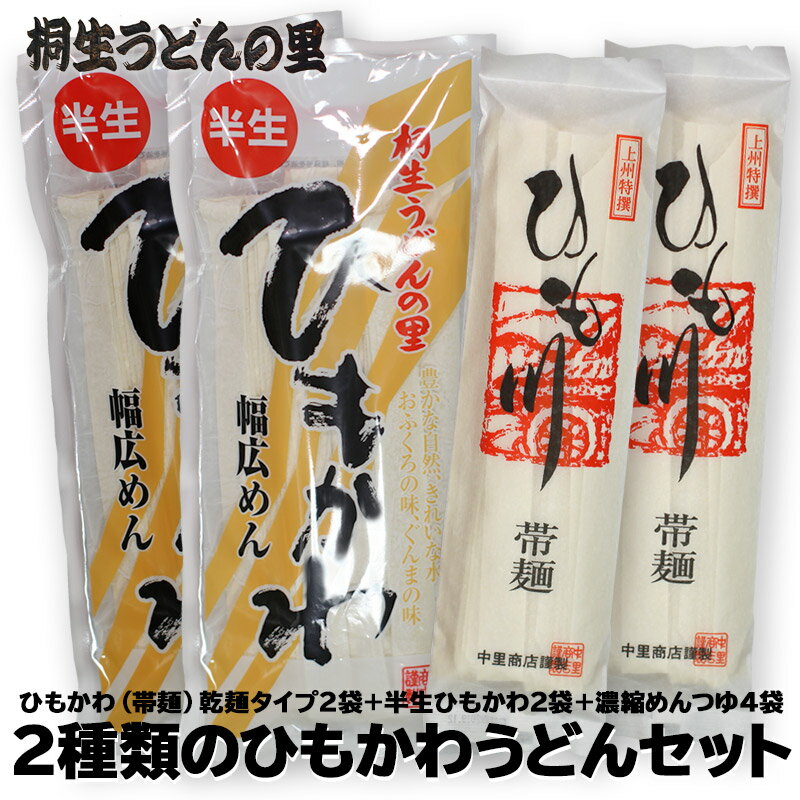 2種類のひもかわうどんセット 【送料無料】ひもかわ(帯麺)乾麺タイプ2袋+半生ひもかわ2袋+濃縮めんつゆ4袋 おっきりこみ ※沖縄・離島については中継料ご負担下さい。【RCP】