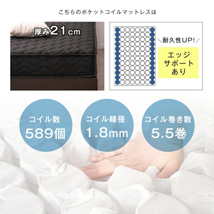 【スタッフみどぅのおすすめポイント!】・身体を点で支え、体圧分散に優れたポケットコイルマットレス・側面は快適な3Dメッシュ・理想的な寝姿勢を作る、快適な寝心地・形崩れを防止し、耐久性UP!エッジサポート・耐久性、通気性に優れた並行配列コイル・ISO9001認定工場で生産した安心の品質・片面仕様にすることで、お手入れも簡単に・コイルを外側から守るヘム加工・肌触りの良い表面ニット生地・有害なホルムアルデヒドを一切含まない、ノンホルムアルデヒド・圧縮梱包だから、搬入もラクラク!重量約17kg素材【表地】ニット生地(ポリエステル100%)、【裏面】不織布【内部】ポケットコイルスプリング、不織布・ウレタンフォーム・フェルトカラーホワイト、ブラック梱包サイズ幅30×奥行30×高さ100cm梱包重量:【シングル】約19kg備考【中国製】※配送は全て宅配便(1人)での玄関渡しとなります。