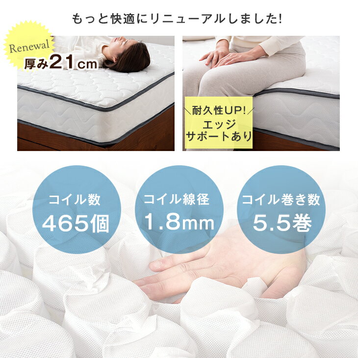 ▼ ご覧のマットレスのサイズ違いはこちら ▼ セミシングル セミダブル ダブル クイーン ▼ ワンランク上の商品はこちら ▼ 腰の沈み込みを防止!3ゾーン構造 極厚21cm3Dメッシュ&プロファイルウレタン ▼オススメのパッド・シーツ パッド・ボックスシーツ一体型 床からの冷え対策に 発熱素材入りフランネル 仕様 サイズ 【シングルサイズ】 幅97x奥行195x厚み21cm コイル数:465個 巻き数:5.5巻 線径:中央1.8mm/両サイド2.0mm 線材規格:SWRH72B C種 ※マットレスは柔らかい素材で作られてますので、圧縮状態からすぐに 復元した状態、また測り方によっては、多少サイズに誤差が生じる場合がございます。