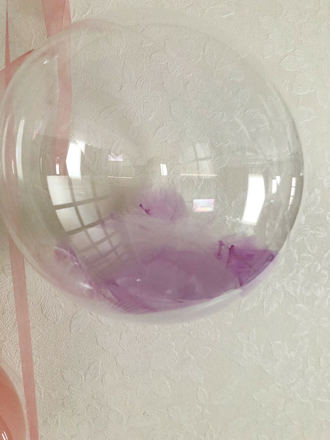 クリアバルーンには、ドライフラワー、プリザーブドフラワー, フェザーが入っていて、光が当たるとキラキラ。