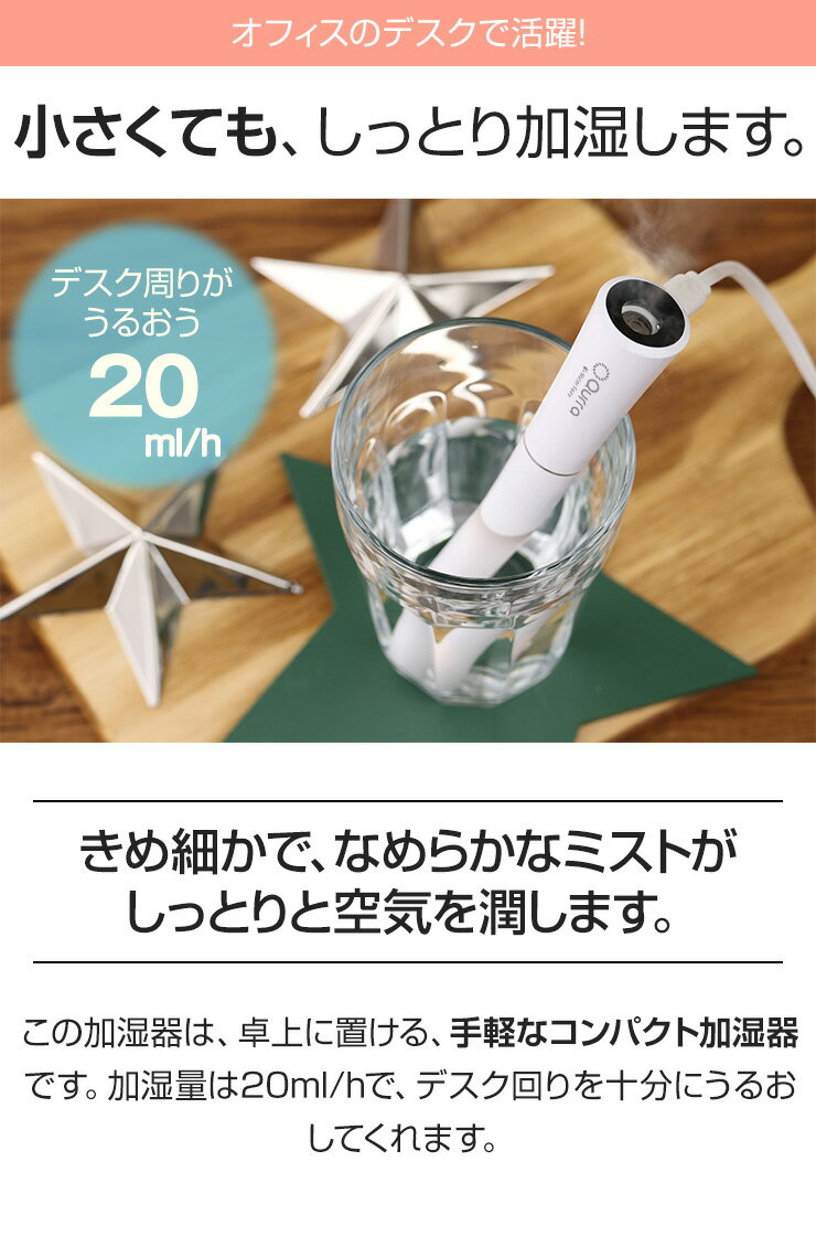 コンパントサイズで狭いデスク周りにもピッタリ! 商品特徴 ・卓上に置ける、手軽なコンパクト加湿器! ・コンパクトサイズながら、加湿量は20ml/h! ・ミストは熱くならず音も静か! ・電源は手軽に給電できるUSB接続! ・容器を選ばず自由に使えます! ・ペットボトルも使えます! ・スリムタイプだから持ち運び楽ちん! ※ご使用の前に、必ず取扱説明書をご確認ください。