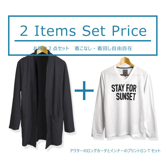 程良い厚みでしっかりとした自然な風合いが特徴のフェザー杢ニットソー素材を使用したカーディガンと ロゴプリント入りの長袖Tシャツがセットになっております。