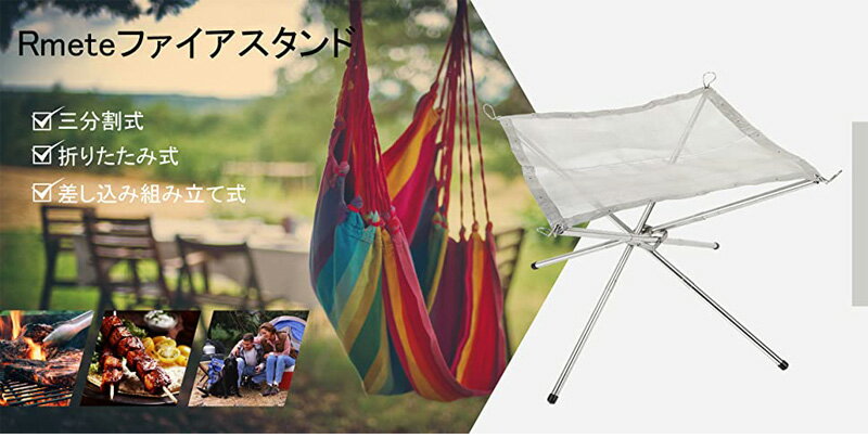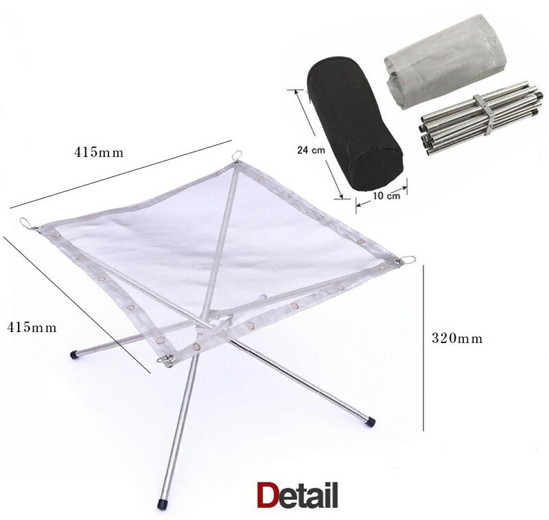 【展開サイズ】約41.5×41.5×34cm 【収納サイズ】約9.5×9.5×24cm 【メッシュシート】特殊耐熱鋼 【スタンド】ステンレス鋼 【重量】 約650g 【耐荷重】約5kg 【収納ケース】600オックスフォードクロス 【スタンド】 三分割、差し込み型スタンド!スタンドの差し込み部は""抜けにくい構造""組み立てた後に焚き火台を持って移動しても差し込みした脚は抜けません。