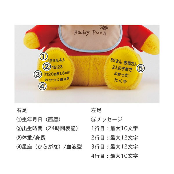 [ ご注文用必要項目記入例 ] ◎新郎新婦様のお名前(漢字) ※フルネームをお願いいたします 【 鈴木 拓哉 】 【 斉藤 さくら 】 ◎右足 1.生年月日(西暦) 【 1997.9.5 】 2.出生時間(24時間表記) 【 16:10 】 3.体重/身長 【 3025g / 54.5cm 】 4.星座 (ひらがな)/血液型 【 おとめ座 / A型 】 ◎左足 5.メッセージ 【 ありがとう 】1行目10文字まで 【 幸せになります 】2行目12文字まで 【 さくら 】3行目12文字まで 【 2020.12.25 】4行目10文字まで ※全て全角表記(漢字・ひらがな・カタカナ・数字・英字) ※全て中央揃いにメッセージが入ります。