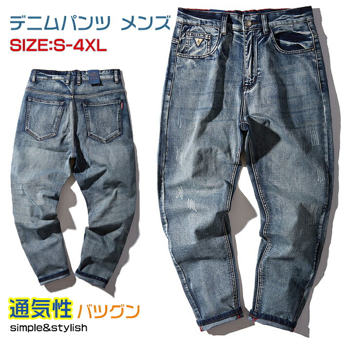 【在庫処理】 デニムパンツ メンズ クロップドパンツ ゆったり風 七分丈 ジーンズ 男性 ストレートパンツ カジュアルパンツ ダメージ加工 ジーパン 大きいサイズ 夏