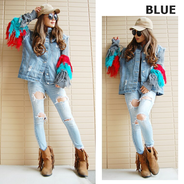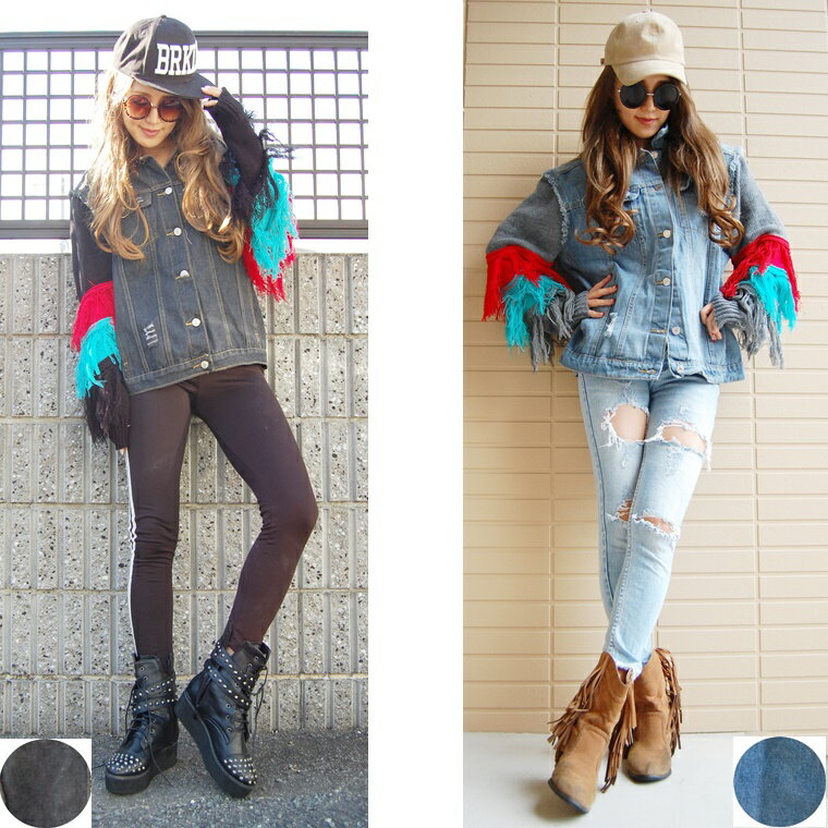 【送料無料】【宅急便送料込み】袖ニット切り替えカラーフリンジデニムジャケット2色/Gジャン/ライトブルー/ブラック黒/カラフル/アウター/BIG/ヴィンテージ/ダメージ/レディース/大きいサイズ/ゆったり/大人カジュアル/ダンガリー/サックス/ブリーチ